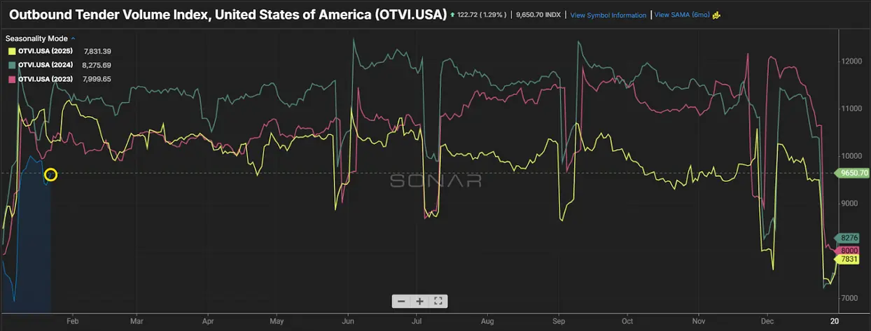 - Outbound tender volume jumps back up in January, but still down vs. this same time last year.