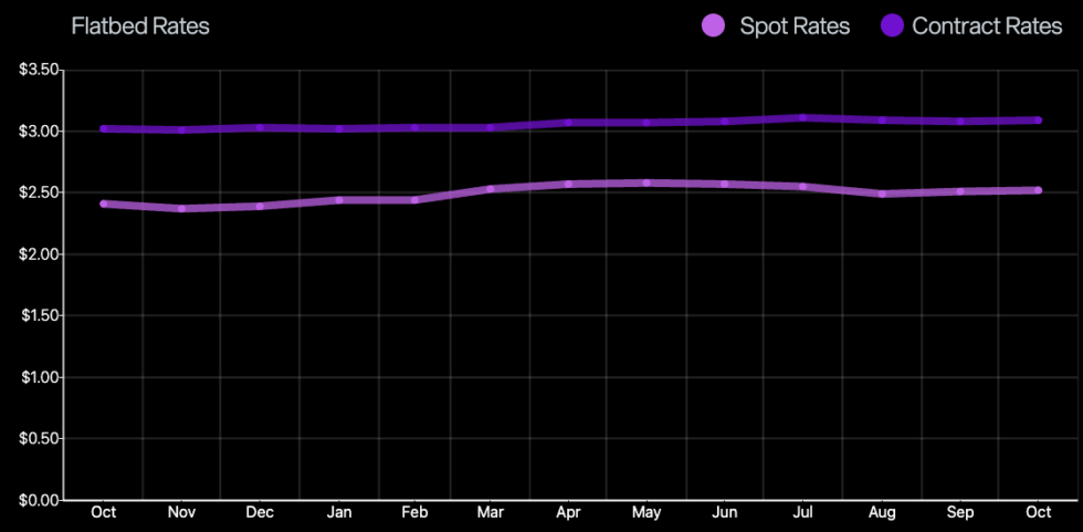 Flatbed spot rates were down (0.4%) vs. last year and (0.9%) vs. last month. Capacity grew tighter by 108.0% vs. last year but improved by 13.1% over last month. September Flatbed contracted pricing is tracking up $0.57 per mile over the spot market.