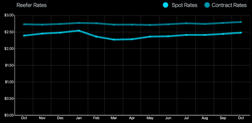 Reefer spot rates increased (0.4%) vs. last year but decreased (0.9%) vs. last month. Capacity grew tighter by 74.0% vs. last year but improved 12.2% vs. last month. September Reefer contracted pricing is tracking up $.32 per mile over the spot market.
