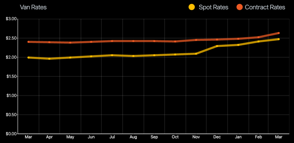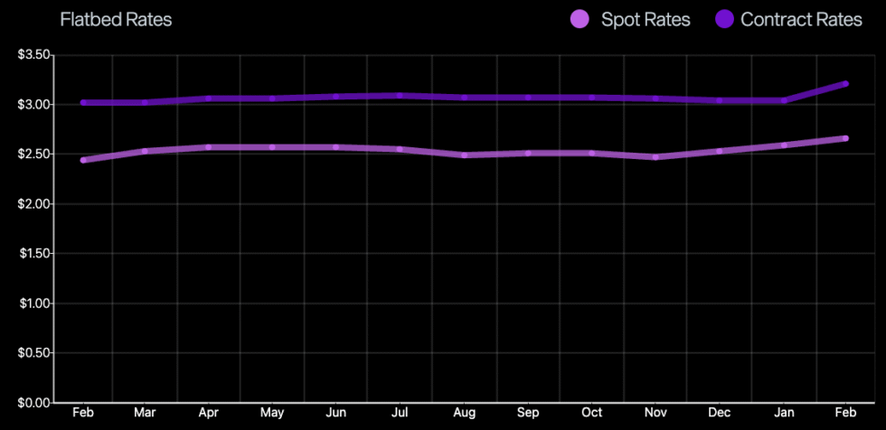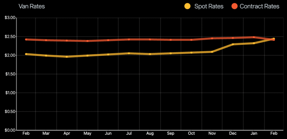 As of January 2026, national spot trucking rates per mile show Van rates at $2.32, Flatbed rates at $2.59, and Reefer rates at $2.81.