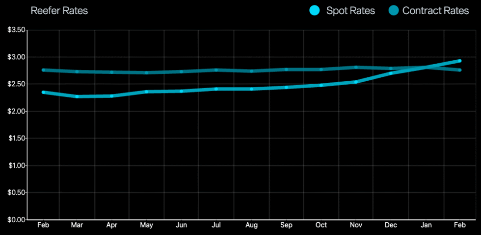 Reefer spot rates increased 4.1% vs. last month. Capacity grew tighter 58.9% compared to last year and 8.1% compared to last month. January reefer contracted pricing is in line with the spot market.